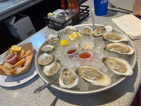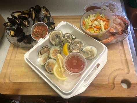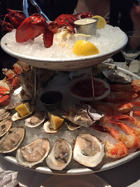 Not only are seafood towers aesthetically pleasing to me, but in my abstemious Weight Watchers addled brain, it’s zero points so I can have 3 glasses of wine with it. According to an AI search result, a seafood tower has about a bajillion grams of protein if you take it down yourself. The eating disordered fitness community that is constantly trying to harpoon my self esteem on Instagram would be so pleased! I cannot stress enough how much I love seafood towers. It is my favorite thing to order in a restaurant, if available and a top tier thing to eat when the heat of our ceaselessly heating planet creeps into meal time.